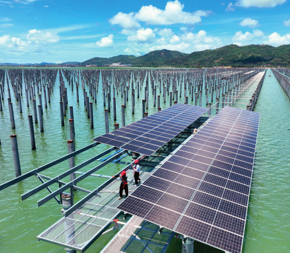施工人员在位于福建省东山县杏陈镇、前楼镇海域的海上光伏电站现场安装支架和光伏组件林善传摄 / 本刊