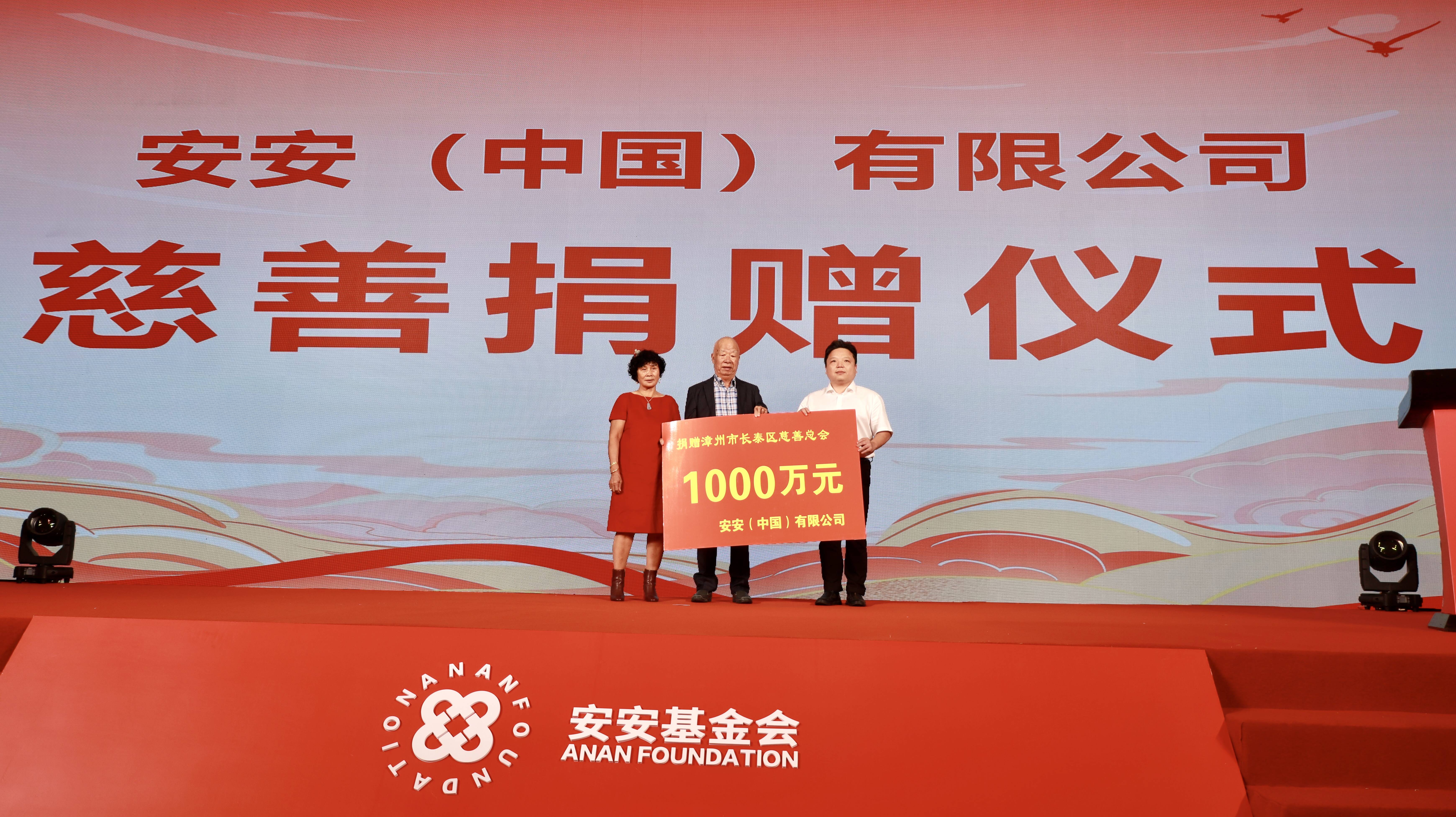 近日,在安安基金会成立20周年庆典上,安安(中国)有限公司荣誉董事长张文彩、丁掩治伉俪向晋江市慈善总会、漳州市长泰区慈善总会分别捐赠人民币1000万元,专项用于奖教事业、医疗领域和乡村振兴领域。区长吴子毅,区人大常委会主任陈贵芬,区政协主席叶水山,区领导周俊雄,区委常委、统战部部长林调兴出席活动。