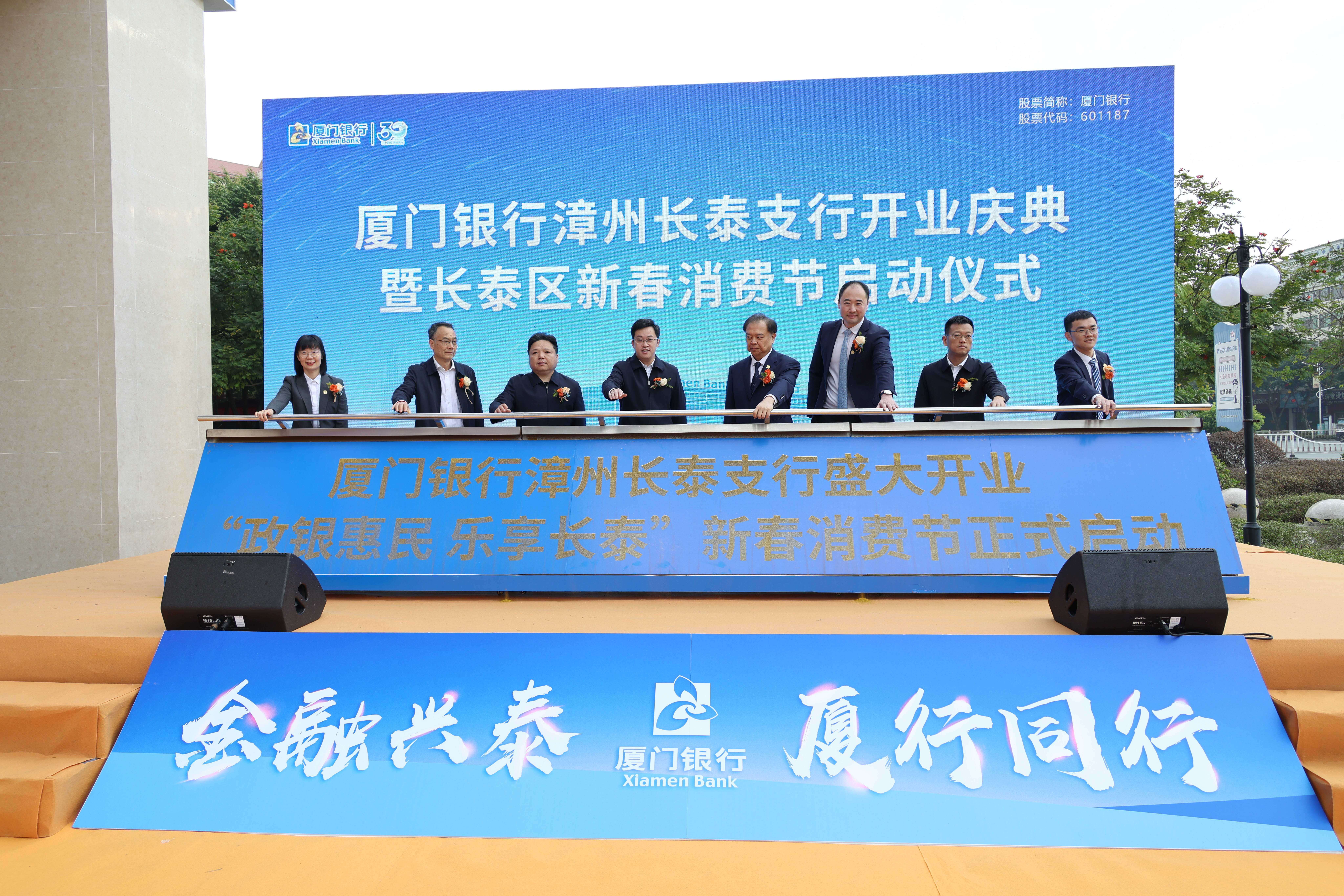 签约仪式后,与会领导嘉宾共同推动启动杆,长泰区“政银惠民 乐享长泰”新春消费节活动正式启动,厦门银行漳州长泰支行同时揭牌开业。