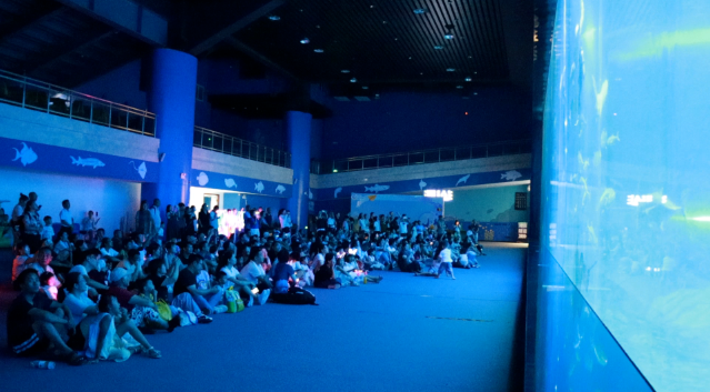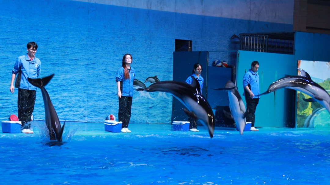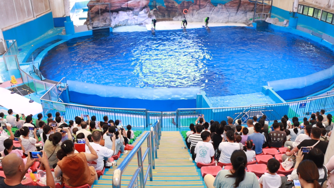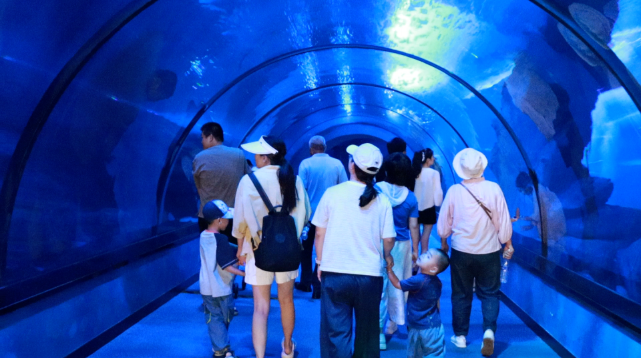记者来到景区,看见不少游客一早便抵达园区,在景区门口有序排队检票,景区内人头攒动,欢声笑语不绝于耳。海豚表演热闹非凡,海豚在台下与训练师密切配合,展示高难度动作,群众拿出手机,不时与海豚互动打招呼。而在海底巨幕前,游客们驻足观赏美人鱼表演,美人鱼在水中翩翩起舞,鲨鱼、蝠鲼等海洋生物不时从身旁掠过,引来阵阵惊叹。