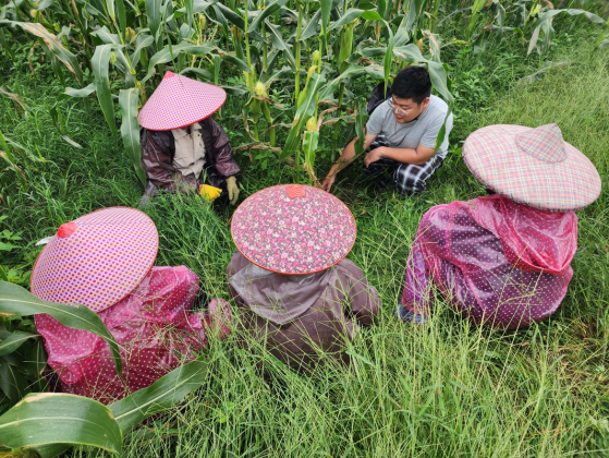 基地指导老师叶德练(右一)指导农户鲜食玉米田间生产