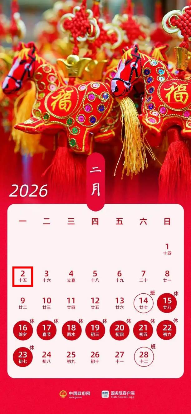 2月15日(农历腊月二十八)至23日(农历正月初七),共9天。2月14日(周六),2月28日(周六)上班。