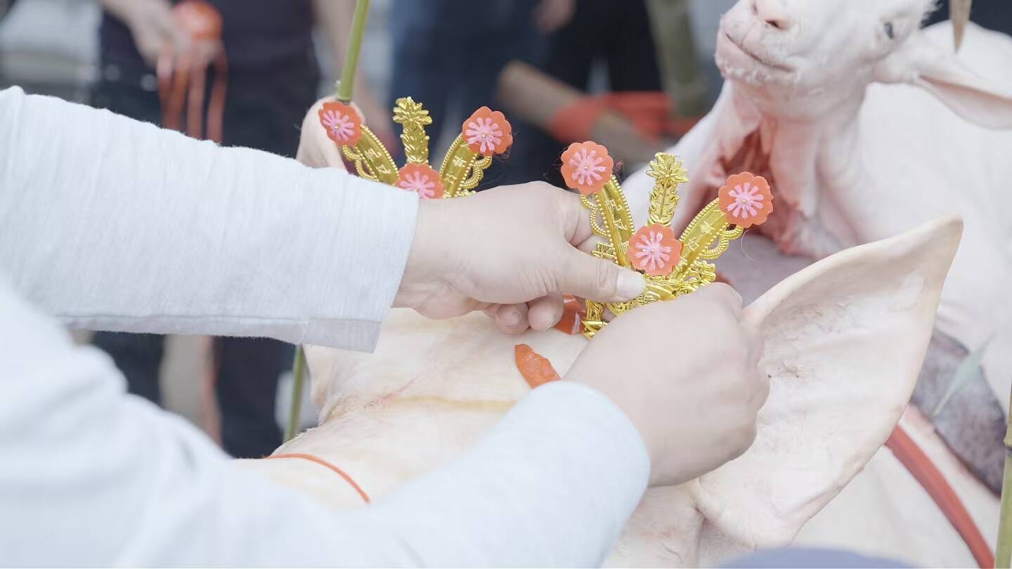 在山重村,“赛大猪·祈丰年”活动准时开始。下午,村广场上聚满了人。各家各户把精心挑选的大猪抬出来,披红彩、衔福桔、贴红纸,一头挨一头并排摆在特制的木架上。围观的人群里三层外三层,手机、相机举得老高。