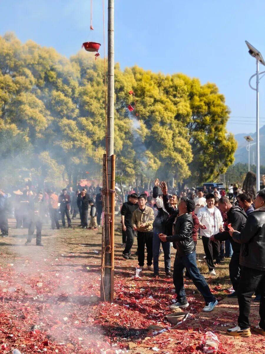 坂里乡丹岩村的“攻炮城”活动也热闹非凡。村民们手持“炮弹”瞄准高处的“炮城”一次次投掷,鞭炮声噼里啪啦响成一片。从北京来的游客张先生举着手机录个不停:“我在网上看到有这个活动,专门来感受这种气氛。”