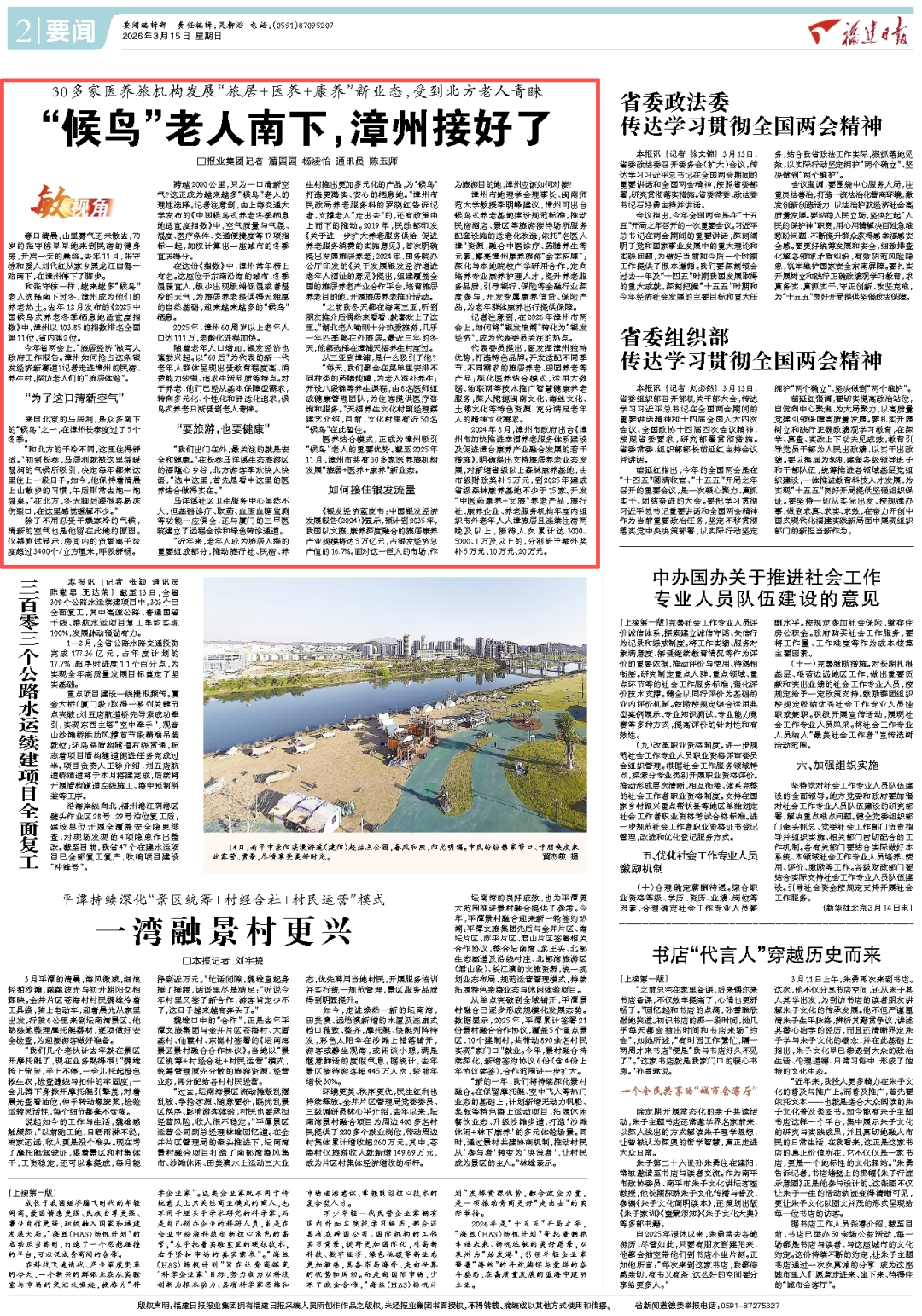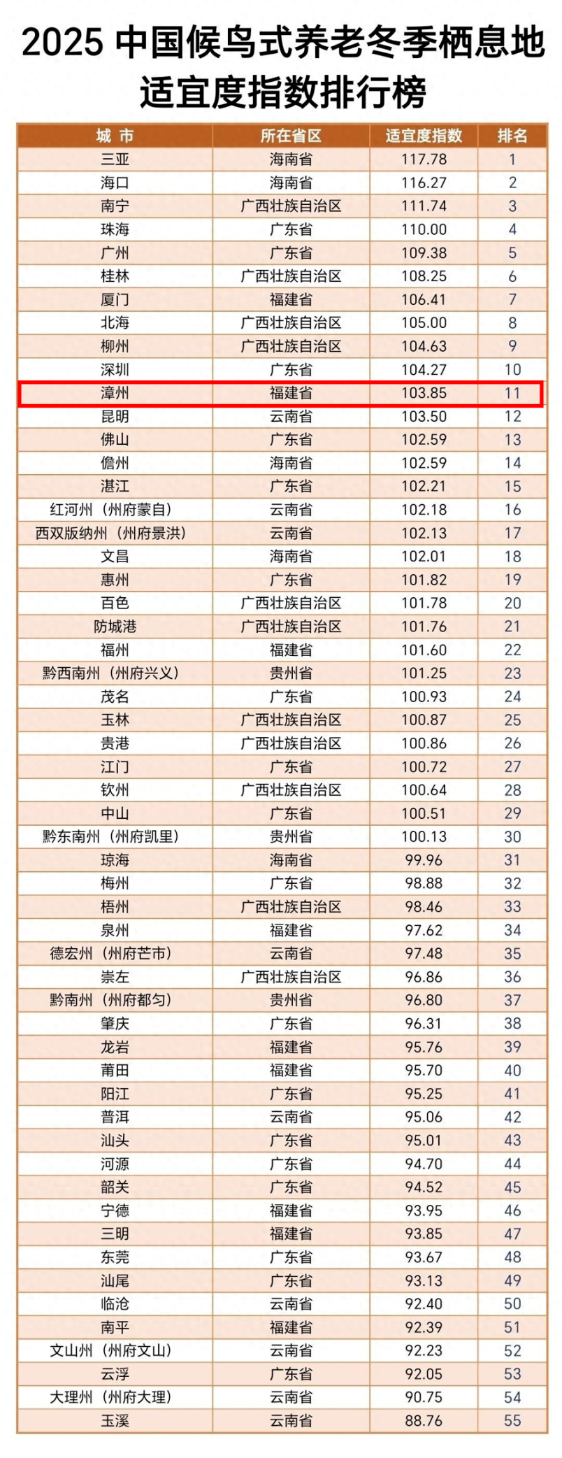 和张守栋一样,越来越多“候鸟”老人选择南下过冬,漳州成为他们的养老热土。去年12月发布的《2025中国候鸟式养老冬季栖息地适宜度指数》中,漳州以103.85的指数排名全国第11位、省内第2位。