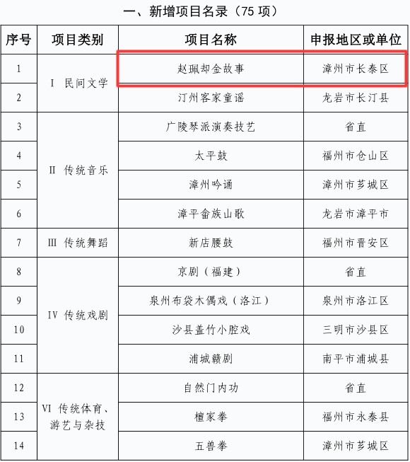 今天,福建省人民政府公布第八批省级非物质文化遗产代表性项目名录,长泰赵珮却金故事入选。