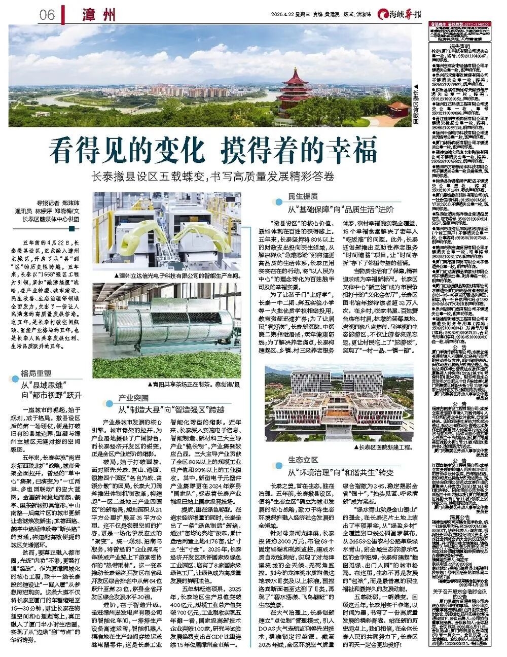 五年前的4月22日,长泰撤县设区,正式融入漳州主城区,开启了从“县”到“区”的历史性跨越。五年来,长泰以“1658”强区工程为引领,紧扣“融漳接厦”战略,在产业转型、城市建设、民生改善、生态治理等领域全面发力,交出了一份让人民满意的高质量发展答卷。这五年,是长泰打破空间瓶颈、重塑产业格局的五年,也是长泰人民共享发展红利、生活品质跃升的五年。