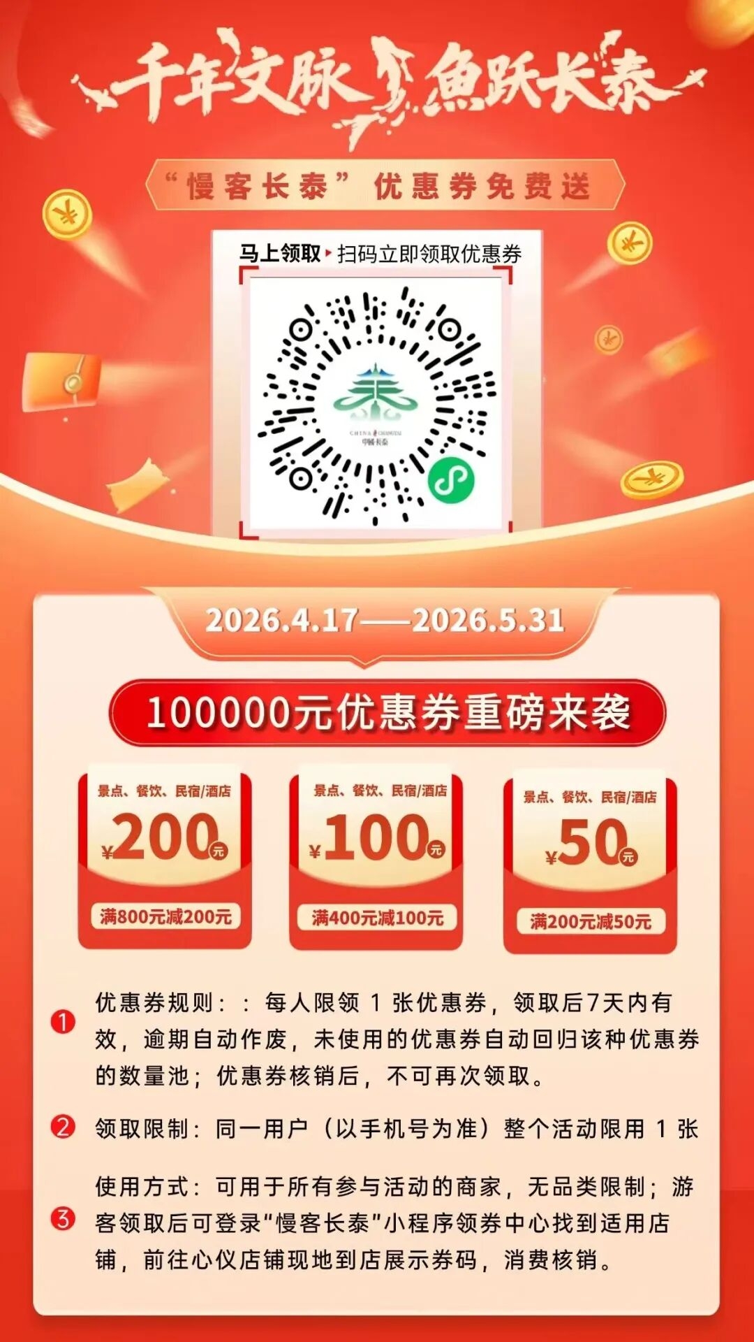 总额10万元的文旅惠民消费券已上线,覆盖住宿、餐饮、景区门票,面额为满200减50、满400减100、满800减200。4月17日至5月31日,每日上午9:00通过“慢客长泰”微信小程序准时开领,数量有限,先到先得。