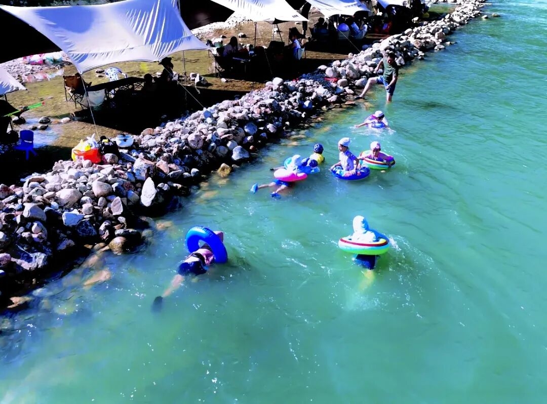 清晨的阳光洒进长泰区枋洋镇,内枋村的鱼鳞坝上已传来阵阵欢笑声。倾泻而下的水流泛起朵朵白色水花,从空中俯瞰,片片“鱼鳞”银光闪闪,颇为壮观。孩子们在“鱼鳞”状的小泳池中尽情玩耍嬉戏,下游浅水区,游客们支起小型水上“餐吧”,围炉煮茶,畅享清凉。
