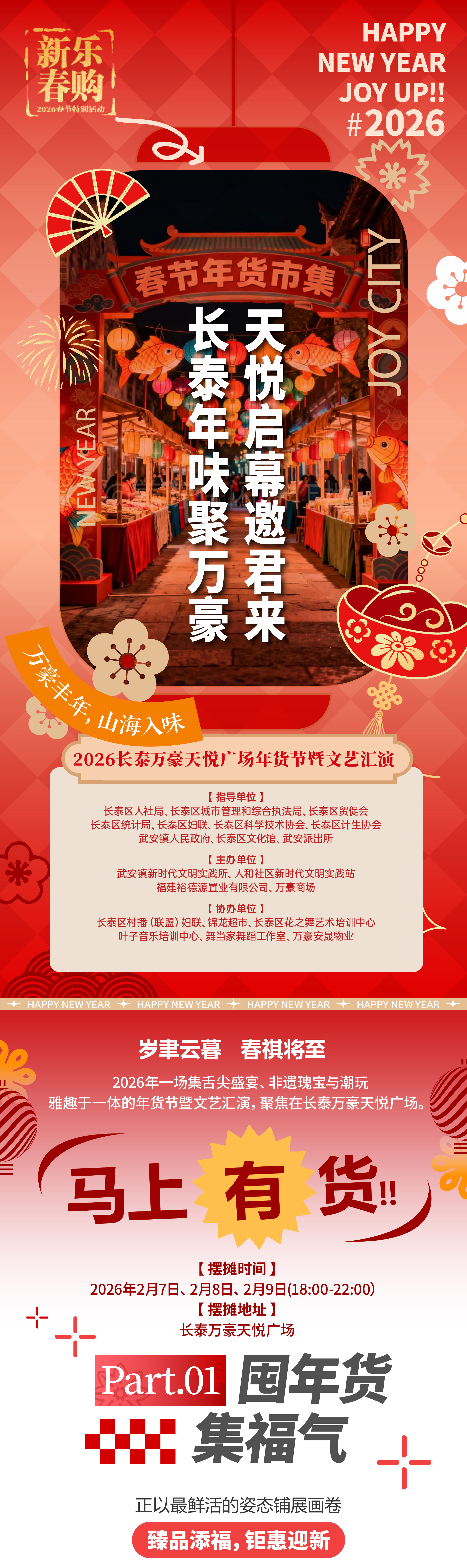 为深入贯彻落实省市关于促消费、稳增长工作部署,持续优化消费环境、丰富消费场景,长泰区定于2月7日至9日在万豪天悦广场举行2026长泰万豪天悦广场年货节暨文艺汇演。