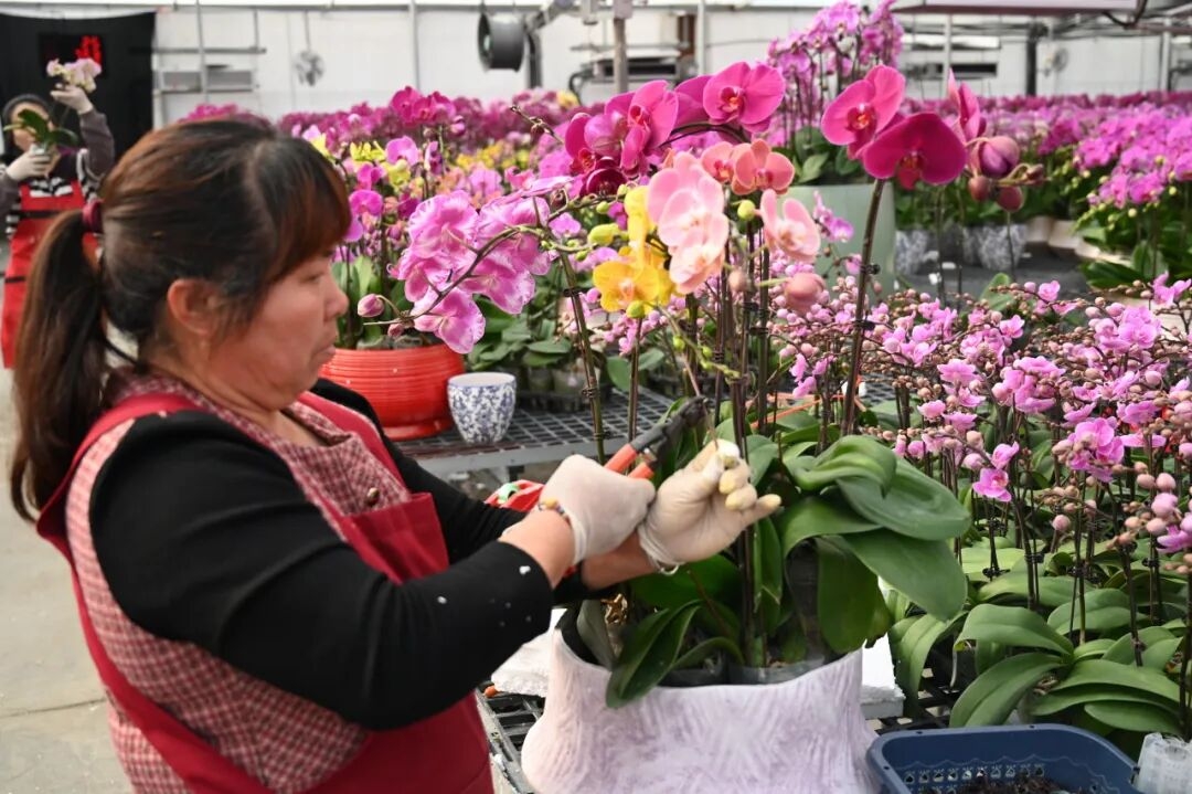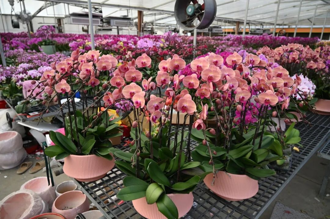 走进美彭村的兰花种植基地,形态各异的蝴蝶兰竞相绽放、争奇斗艳。企业负责人林先生介绍,基地内种植了3000平方米的蝴蝶兰,自元旦起陆续上市,目前正值销售高峰,每盆售价可达260-400元,成为不少市民装点家居、馈赠亲友的“年宵花”首选。