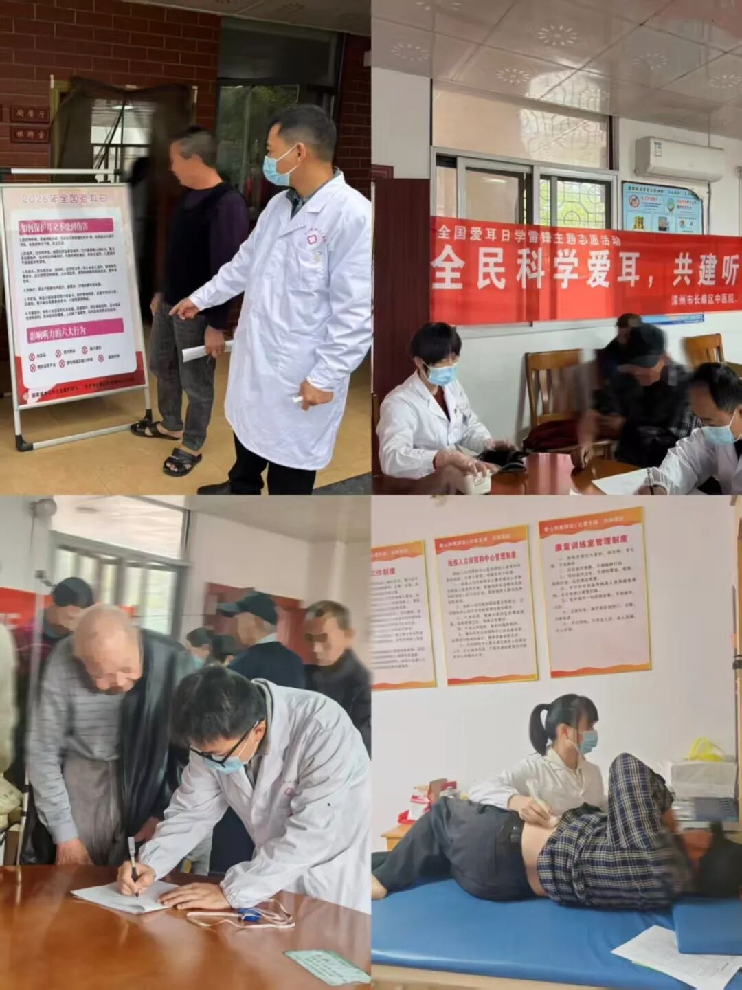 活动现场,长泰区中医院与陈巷中心卫生院的医护人员忙碌的身影穿梭于老人之间。区中医院书记及陈巷卫生院院长带头走在服务一线,与两院的医护人员一同耐心询问每位老人的日常生活与健康状况。在服务过程中,医护人员还专门开展了听力残疾预防与康复知识的宣传,向老人们讲解常见的听力损伤原因、日常保护措施以及早期干预的重要性,帮助老人增强听力健康意识,做到早预防、早发现、早干预。
