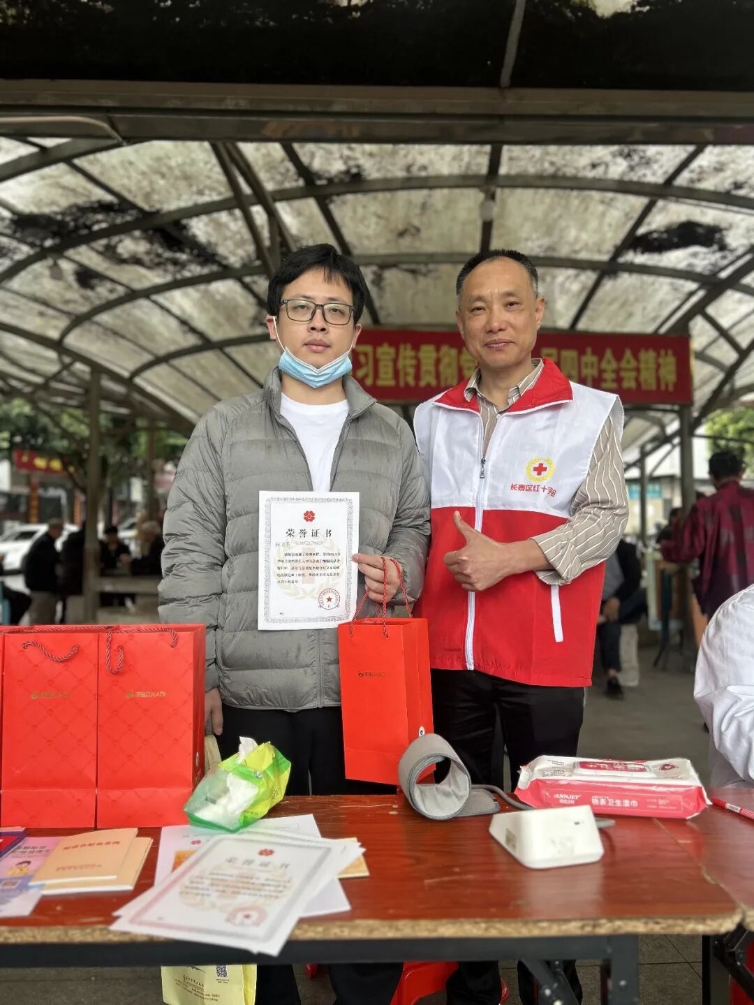 ▼泰坤公园的红十字志愿者指导群众扫码登记献血