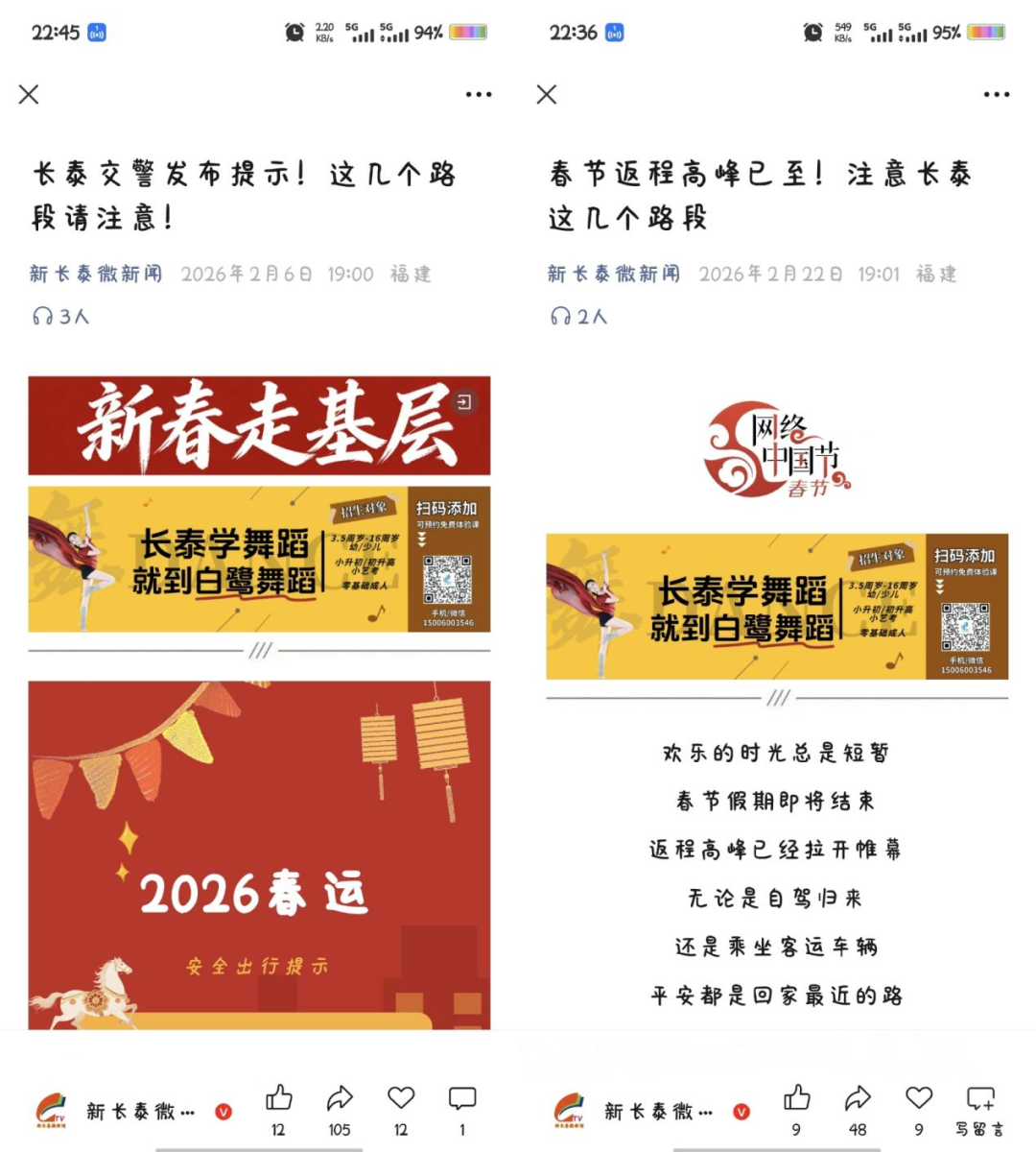 40天温暖守护 长泰公安交警 护航春运平安路 2026年春运从2月2日开始至3月13日结束,历时40天。面对“9天超长春节假期”带来的大客流、大车流考验,以及节后返程高峰与春季阴雨天气叠加的复杂形势,长泰公安交警严格按照省厅总队、市局支队关于春运后期道路交通安全管理工作的部署要求,以“平安春运、交警同行”为主题,全警动员、全力以赴,从严从实抓好各项安保措施落实,用坚守书写了一份沉甸甸的平安答卷,圆满完成了春运各项安保任务。 周密部署 压实责任强根基 春运启动当日,长泰区举办2026年春运交通安保启动仪式,长泰区副区长、公安分局局长吴荣辉作动员部署,强调要以“时时放心不下”的责任感,聚焦平安、便捷、温馨出行目标,全力保障群众春运出行安全。大队结合辖区实际,提前制定春运安保方案,科学部署警力,明确重点路段、重点时段管控措施;开展道路隐患排查整改工作,始终坚持人民至上、生命至上,时刻紧绷安全弦,以高度的政治责任感和对人民群众生命财产安全高度负责的态度,抓实抓细道路交通安全管理各项措施,坚决筑牢道路交通安全防线,为春运安保工作奠定坚实基础。 源头管控 消除隐患筑防线 春运前,大队联合交通运输等部门,对客运企业、危化品运输公司开展全覆盖“体检”。从动态监控台账到车辆安全设施,从驾驶人资质到应急预案,逐一过筛、闭环整改,从源头上拧紧春运“安全阀”。春运期间,持续深入快安物流等重点运输企业开展检查宣传,与企业负责人座谈交流、签订责任书,压实企业主体责任,确保人、车、企全环节安全可控。 严查严管 高压态势守底线 春运是团圆的日子,也是酒驾醉驾、超员超载等违法行为的易发期。长泰公安交警保持严管高压态势,紧盯餐饮娱乐场所周边、城乡结合部、农村道路等重点区域,高频次开展酒醉驾专项整治行动。依托春运执法服务站,对“两客一危一货一面”等重点车辆逢车必查,严防超员、疲劳驾驶等违法行为。同时,针对农村民俗活动增多、春耕农忙即将开始的实际情况,大队加强对农用车违法载人、骑乘电动车不戴头盔等行为的劝导查处,严防“两违”行为引发事故。 疏堵保畅 科学调度护通行 春运期间,辖区车流量大幅攀升,景区周边、商圈路段迎来一波波高峰。节后返程、学生返校、工人返岗、企业复工复产等因素叠加,流量较前半程更加集中。长泰公安交警提前研判、科学布警,在十里蓝山、天柱山等景区周边及城区、学校主要路口,采取“定点值守+铁骑巡逻+视频巡查”相结合的模式,全力疏堵保畅。40天里,他们迎着晨曦上岗,伴着星夜归队,守护着每一辆车的平安通过。 宣传引领 多措并举强意识 交通安全开学第一课 围绕春运主题,大队多形式开展交通安全宣传。春运启动日举办全区启动仪式,现场开展主题宣传;节前通过微信公众号发布“两公布一提示”,公布交通流预判、易拥堵路段及绕行建议。深入锐腾电器等重点用工企业,针对返乡务工人员开展专题宣传,设置酒醉驾模拟体验区;走进天柱山景区,为驾驶员讲解山路行车安全要点;深入津城环卫公司,面向一线环卫工人开展针对性安全防护教育。走进辖区消防大队开展“筑牢行车安全防线 守住救援生命通道”主题道路交通安全知识专题讲座,交警大队借助民俗活动人员集中、氛围浓厚的有利时机,深入活动现场开展“美丽乡村行”交通安全宣传活动,将平安知识送到群众身边。在辖区大排档、烧烤店等涉酒场所广泛张贴“拒绝酒驾”宣传海报,推广酒后扫码代驾便民服务。利用微信群矩阵转发安全提示信息,形成“点对点推送、群对群扩散”的宣传格局。 40天的春运落下帷幕,但守护从未打烊。当人们奔赴新一年的奋斗,长泰公安交警依然伫立在路口,目送每一辆车平安驶向远方。 春运虽然结束,安全永不止步。长泰公安交警将继续以路为伴、以民为念,守护这座城市的每一条道路,守护每一个奔忙的你。 平安,是回家最近的路;守护,是我们最长情的告白。