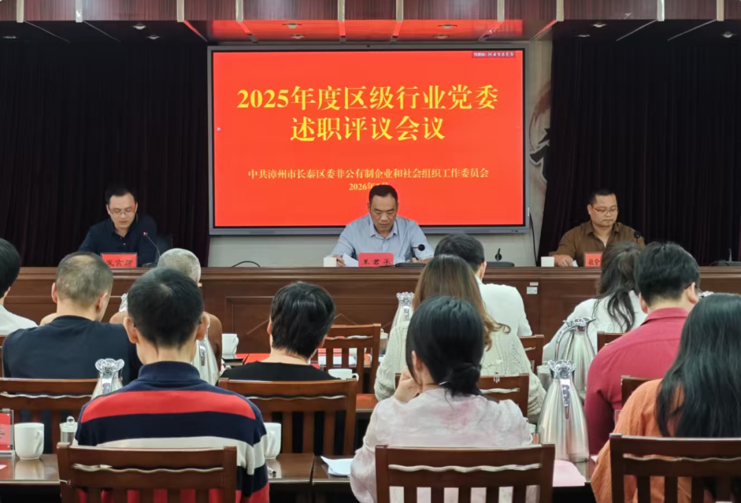近日,中共漳州市长泰区委“两新”工委召开2025年度区级行业党委述职评议会议。区委“两新”工委书记、区委社会工作部部长王君承,各区级行业党委书记、各成员单位分管领导共33人参会。会议书面通报了2025年度全区新兴领域党建工作情况报告,采取“一述一评”方式组织区级行业党委书记进行了现场述职,与会人员对述职单位开展了现场测评。