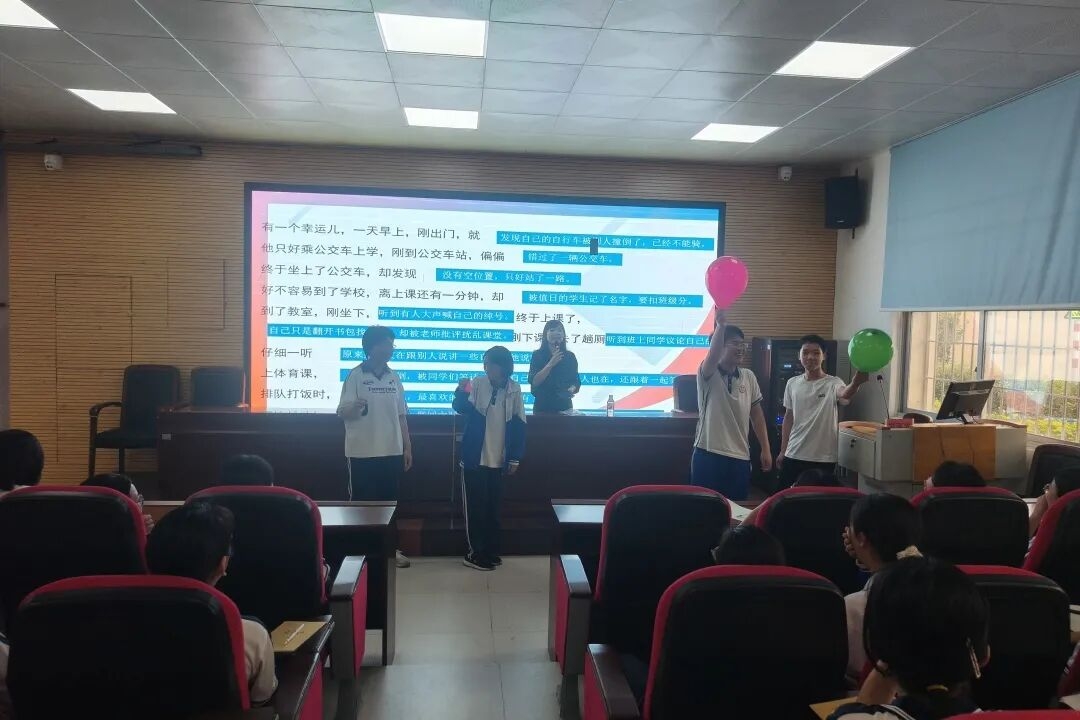 讲台上,几位“幸运儿”被老师选上台参与破冰游戏,他们正对着手里的气球猛吹气,脸都憋红了!台下同学们的心也跟着气球一起鼓了起来……