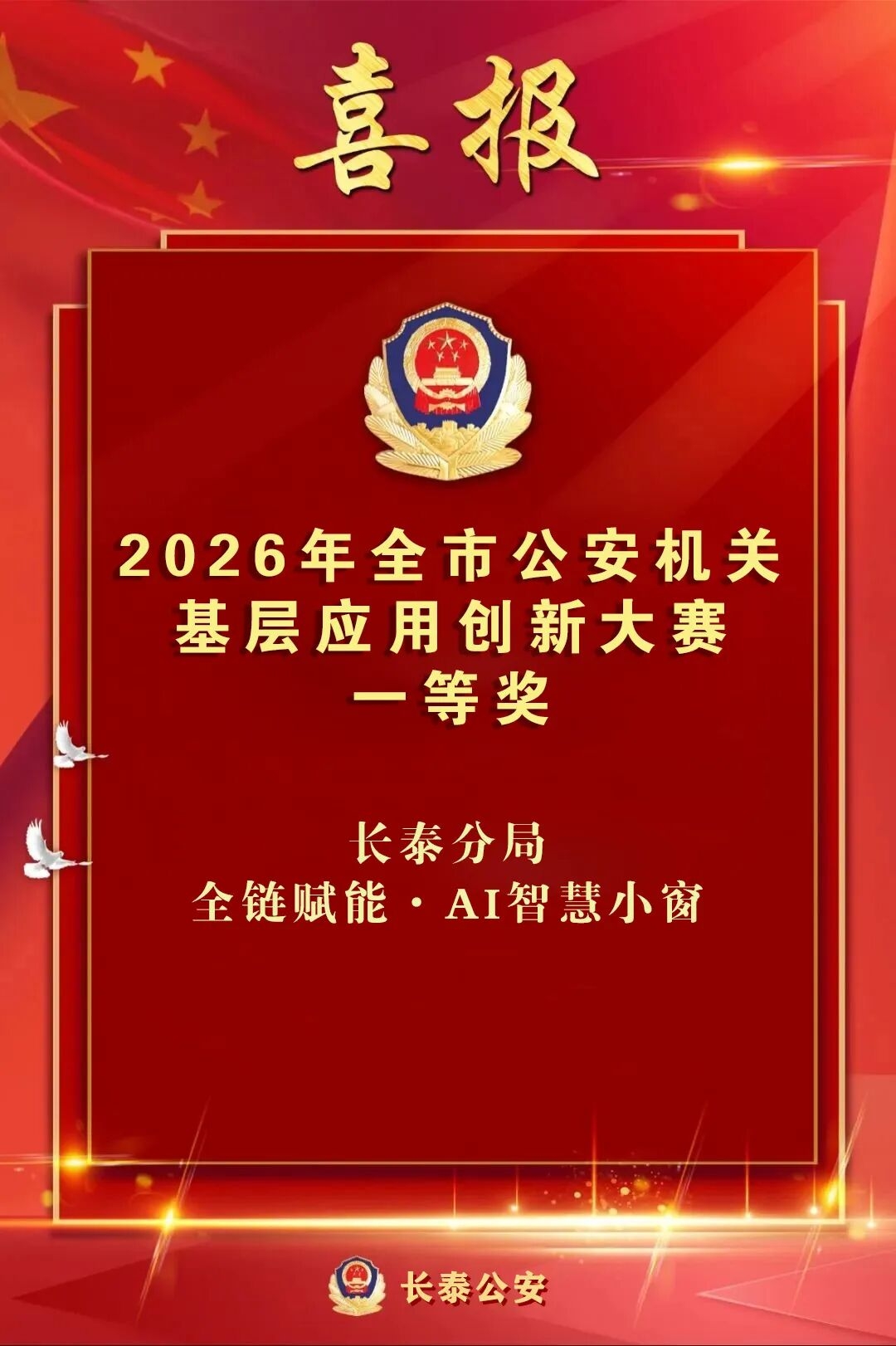 用创新赋能实战,以匠心守护平安。在刚刚落幕的2026年全市公安机关基层应用创新大赛中,长泰分局“全链赋能·AI智慧小窗”项目从众多优秀项目中脱颖而出,获评一等奖!