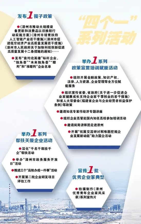 今年的“漳州企业家日”以“促进健康成长 支持干事创业”为主题,通过发布一揽子政策、进行一系列政策宣贯培训赋能活动、开展一系列帮扶关爱活动、宣传一批优秀企业家典型等“四个一”活动,以更优质服务暖心、更扎实举措支持,着力将“漳州企业家日”打造成政府高效服务、企业积极参与、政企良性互动的亲情政商关系特色品牌,不断激发市场主体活力,推动全市民营经济高质量发展迈出更大步伐。
