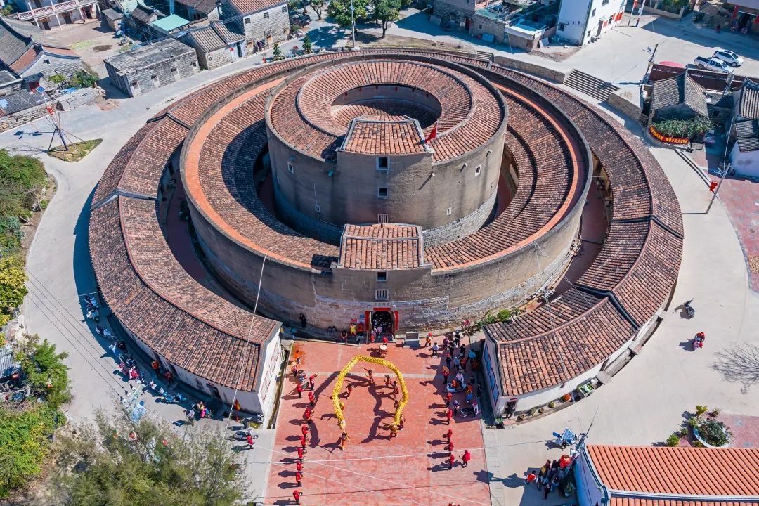 锦江楼位于深土镇锦东村,清乾隆五十六年(1791)林升泽始建,这座有着两百多年历史的土楼,被誉为“闽西南土楼建筑群中的一朵奇葩”,“内高外低”兼具单元式和内通廊式的建筑风格独具特色,是建筑与美学融合的艺术价值体现,更是乱世中为家为民的宏愿表达,从里到外,故事不尽。