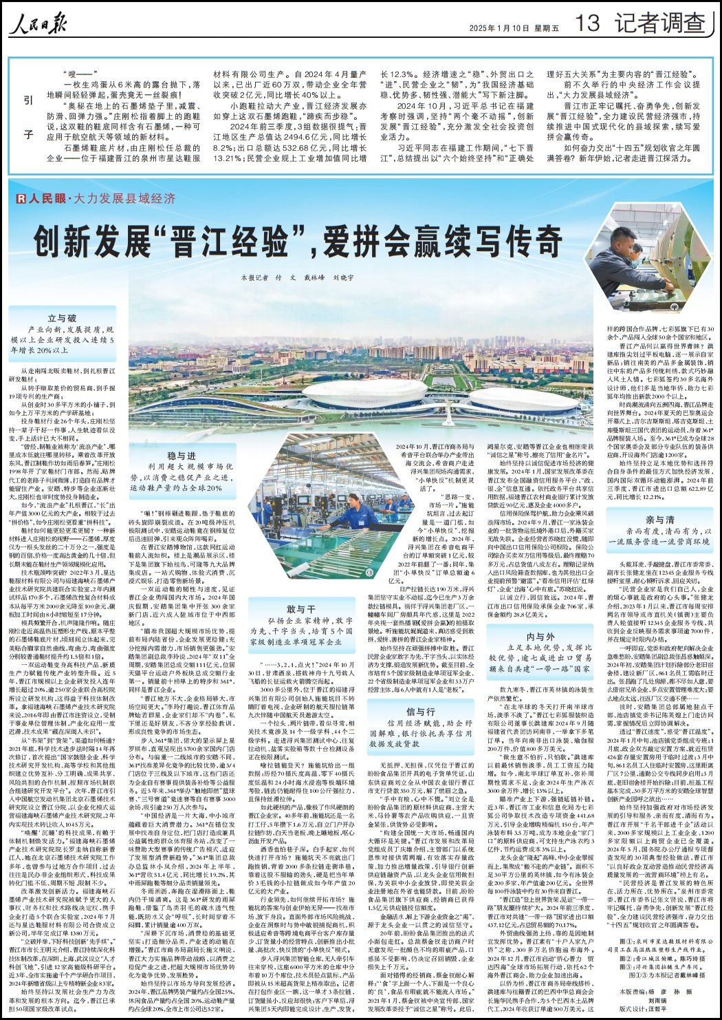1月10日,人民日报记者调查版刊发整版报道《创新发展“晋江经验”,爱拼会赢续写传奇》,聚焦福建晋江创新发展“晋江经验”,持续推进中国式现代化的县域探索, 经济增速之“稳”、外贸出口之“进”、民营企业之“韧”,为“我国经济基础稳、优势多、韧性强、潜能大”写下新注脚。