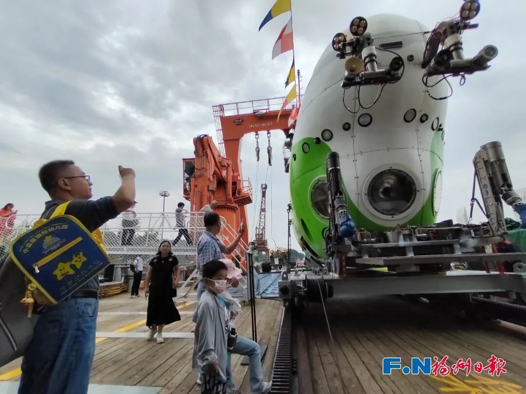 左图:载人潜水器支持保障母船“探索二号”科考船。(马尾造船公司供图)右图:“探索二号”科考船携带“奋斗者”号来福州交流。